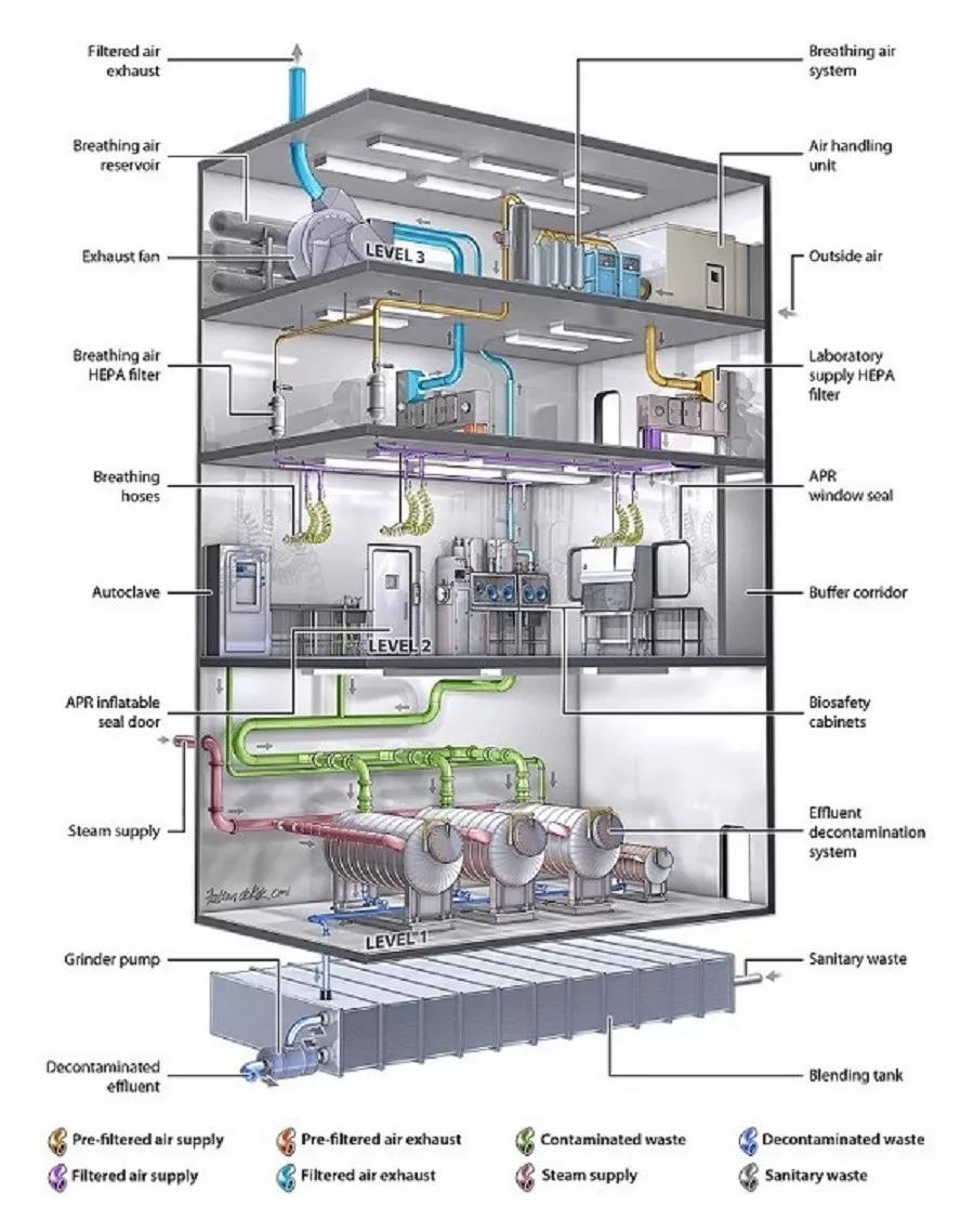 P4实验室作为最高级别的生物安全实验室,是应对高危险性、且无法预防和治疗的烈性病毒的利器。P4实验室一般为一栋独立的建筑物,如与其他级别生物实验室共用建筑物,也需要在建筑物中占据独立的隔离区域,并与附近的其他建筑物完全隔离。在常见的四层结构中,一层为污水处理与保障设备,二层为核心实验区,三层为排风管道过滤层,四层为空调设备与送排风管道。